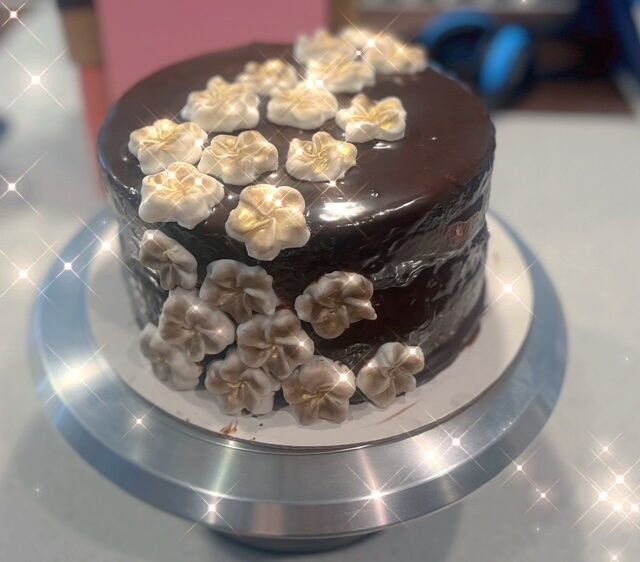 Layers of Vanilla bean cake, filled and topped with Vanilla bean Buttercream Frosting